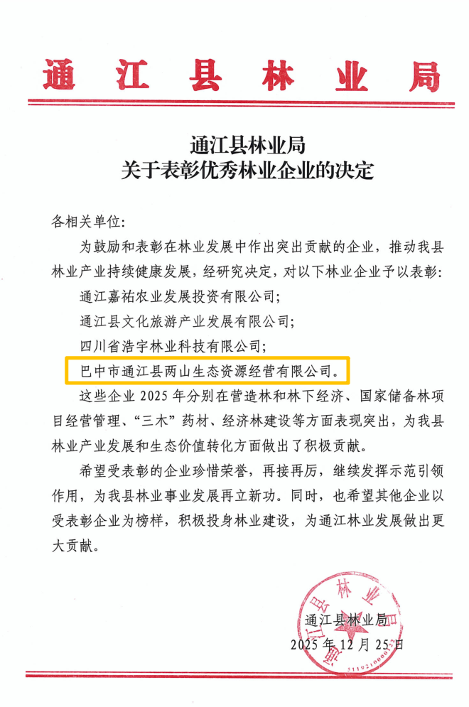 近日,巴中兩山公司被巴中市林業(yè)局通報(bào)表?yè)P(yáng)為2025年度林業(yè)重點(diǎn)工作“表現(xiàn)突出單位”。下屬企業(yè)通江縣兩山公司被通江縣林業(yè)局授予“優(yōu)秀林業(yè)企業(yè)”稱(chēng)號(hào)。